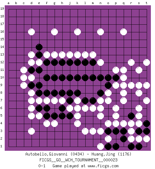 Last move : 0-1 2024 May 10 19:39:42 [Event "FICGS__GO__WCH_TOURNAMENT__000023"] [Site "FICGS"] [Date "2023.10.04"] [Round "1"] [Black "Autobello,Giovanni"] [White "Huang,Jing"] [Result "0-1"] [Rating 1 "0434"] [Rating 2 "1176"] 1.k10 d5 2.l10 d16 3.j10 q16 4.m10 q4 5.h10 d10 6.n10 q10 7.o10 k16 8.g10 k4 9.p10 p11 10.q9 q11 11.r10 r9 12.r8 s9 13.r11 r12 14.s10 s11 15.t10 t9 16.t11 t12 17.f10 q8 18.p8 p9 19.o9 q7 20.p7 d3 21.q6 p6 22.r7 q9 23.o6 p5 24.q5 p4 25.o5 o4 26.n4 n5 27.m5 o7 28.n6 o8 29.n8 n7 30.m7 l6 31.o3 m6 32.l7 n5 33.l5 k5 34.k6 n6 35.p3 n3 36.m4 m3 37.l4 l3 38.q3 r3 39.r4 r2 40.q2 s4 41.r5 s5 42.r6 s6 43.s7 t7 44.s3 s8 45.r1 s2 46.t3 d8 47.j5 j6 48.h6 k7 49.j7 k6 50.k8 h7 51.j8 g7 52.g8 f7 53.f8 e7 54.h8 d13 55.d9 c9 56.e9 c10 57.e11 d12 58.h5 g4 59.r5 r4 60.s1 o2 61.d11 c11 62.g5 f4 63.f5 e5 64.e6 d6 65.f6 g16 66.e8 d7 67.o1 n1 68.p1 t2 69.t4 n16 70.e13 e12 71.f12 f13 72.e14 g13 73.g12 h13 74.h12 j13 75.j12 k13 76.k12 l13 77.l12 m13 78.m12 n12 0-1 Follow this game move after move (download)You don't have to be really good anymore to get good results. What's happening with chess is that it's gradually losing its place as the par excellence of intellectual activity. Smart people in search of a challenging board game might try a game called Go. (Hans Berliner, The New York Times, 2003) Life is pleasant. Death is peaceful. It's the transition that's troublesome. (Isaac Asimov)