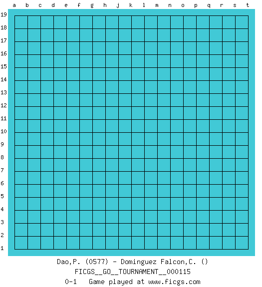 Last move : 0-1 2023 October 7 13:7:51 [Event "FICGS__GO__TOURNAMENT__000115"] [Site "FICGS"] [Date "2023.09.07"] [Round "1"] [Black "Dao,Paul"] [White "Dominguez Falcon,Carlos"] [Result "0-1"] [Rating 1 "0577"] 0-1 This go game has been lost on time (started : 2023.09.07 2:58:40) Follow this game move after move (download)Do not fear furikawari. (Anonymous) Over-the-board chess is the favorite of mortals, correspondence chess is the favorite of the gods. (Eduard Dyckhoff)