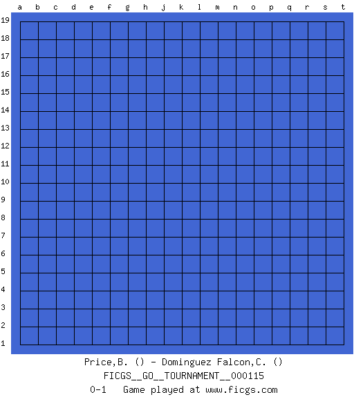 Last move : 0-1 2023 October 7 13:7:51 [Event "FICGS__GO__TOURNAMENT__000115"] [Site "FICGS"] [Date "2023.09.07"] [Round "1"] [Black "Price,Brad"] [White "Dominguez Falcon,Carlos"] [Result "0-1"] 0-1 This go game has been lost on time (started : 2023.09.07 2:58:40) Follow this game move after move (download)When your opponent has two weak groups, attack them both at once. (Anonymous) Dave, my mind is going. I can feel it. (HAL 9000 in 2001, a space odyssey)
