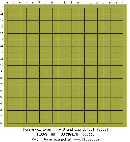 Last move : 0-1 2023 October 7 13:7:51 [Event "FICGS__GO__TOURNAMENT__000115"] [Site "FICGS"] [Date "2023.09.07"] [Round "1"] [Black "Fernandez,Ivan"] [White "Brand Lyard,Paul"] [Result "0-1"] [Rating 2 "0903"] 0-1 This go game has been lost on time (started : 2023.09.07 2:58:40) Follow this game move after move (download)Strange things happen at the one-two points. (Anonymous) To err is human, but to really foul things up requires a computer. (Farmer's Almanac, 1978)