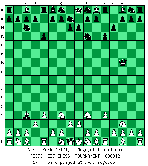 Last move : 1-0 2007 October 17 12:58:42 [Event "FICGS__BIG_CHESS__TOURNAMENT__000012"] [Site "FICGS"] [Date "2007.09.08"] [Round "1"] [White "Noble,Mark"] [Black "Nagy,Attila"] [Result "1-0"] [WhiteElo "2171"] [BlackElo "1400"] 1.j2-k4 j15-k13 2.h2-g4 h16-o10 3.m2-m4 m15-m13 4.e2-e4 e15-e13 5.p1-o3 b16-c14 6.f1-c4 n15-n14 7.d2-d3 1-0 This big chess game has been lost on time (started : 2007.09.08 1:54:3) Follow this game move after move (download)I prefer to lose a really good game than to win a bad one. (David Levy) Die Partien sind immer verschieden, die Interviews immer die gleichen. (Garry Kasparov) El Ajedrez no es una pizca de inferior al violín, y tenemos un gran número de violinistas profesionales. (Mikhail Botvinnik) Les ravages du H expliquent la différence de niveau entre Tal et Thal [Abergel]. Everybody lies. (Gregory House, House M.D.)
