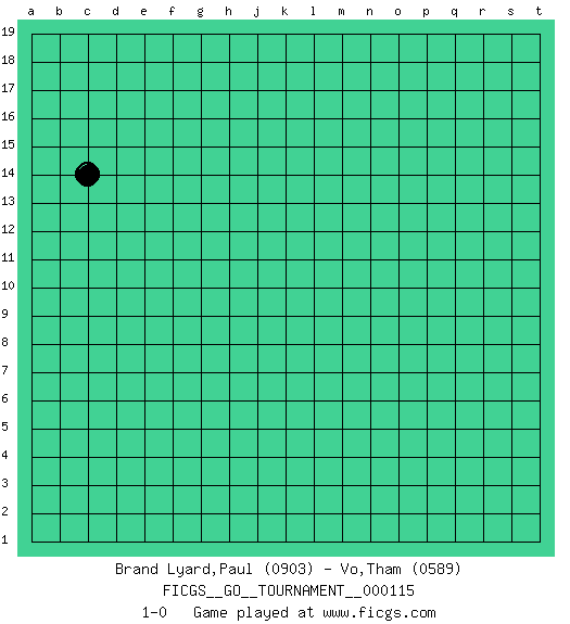 Last move : 1-0 2023 October 8 2:6:26 [Event "FICGS__GO__TOURNAMENT__000115"] [Site "FICGS"] [Date "2023.09.07"] [Round "1"] [Black "Brand Lyard,Paul"] [White "Vo,Tham"] [Result "1-0"] [Rating 1 "0903"] [Rating 2 "0589"] 1.c14 1-0 This go game has been lost on time (started : 2023.09.07 2:58:40) Follow this game move after move (download)Go is to western chess what philosophy is to double entry accounting. (from Shibumi, by Trevanian) Unless I accept my faults I will most certainly doubt my virtues. (Hugh Prather)