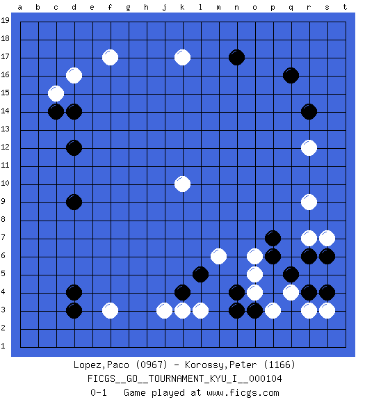 Last move : 0-1 2023 November 29 23:29:15 [Event "FICGS__GO__TOURNAMENT_KYU_I__000104"] [Site "FICGS"] [Date "2023.09.07"] [Round "1"] [Black "Lopez,Paco"] [White "Korossy,Peter"] [Result "0-1"] [Rating 1 "0967"] [Rating 2 "1166"] 1.q16 q4 2.d4 d16 3.o3 p3 4.r6 o4 5.n3 r9 6.r4 r3 7.s4 s3 8.q5 s7 9.s6 r7 10.r14 r12 11.n17 k17 12.c14 f17 13.d12 f3 14.d3 j3 15.k4 k3 16.d9 c15 17.d14 k10 18.n4 o5 19.p6 o6 20.p7 m6 21.l5 l3 0-1 This go game has been lost on time (started : 2023.09.07 3:0:20) Follow this game move after move (download)The possibility or impossibility of an event results logically from the rules. (Pierre Audouard) Ah, beer! The cause of, and the solution to, all of life's problems. (Homer Simpson)