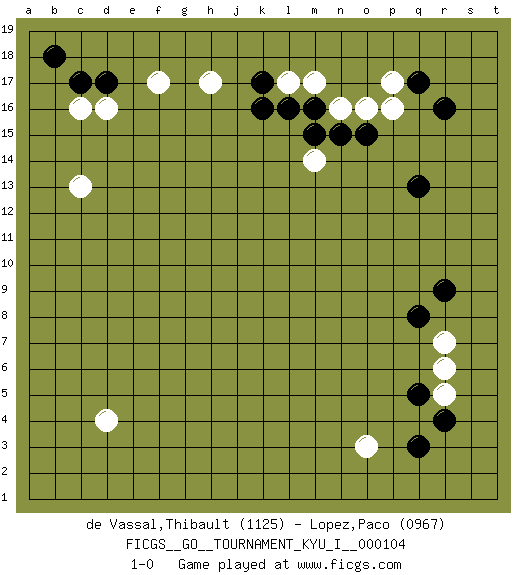 Last move : 1-0 2023 November 25 12:1:5 [Event "FICGS__GO__TOURNAMENT_KYU_I__000104"] [Site "FICGS"] [Date "2023.09.07"] [Round "1"] [Black "de Vassal,Thibault"] [White "Lopez,Paco"] [Result "1-0"] [Rating 1 "1125"] [Rating 2 "0967"] 1.q3 d4 2.r16 d16 3.k16 r5 4.r9 r7 5.r4 p17 6.q17 p16 7.q13 l17 8.l16 m17 9.k17 h17 10.c17 c16 11.d17 f17 12.b18 c13 13.m16 n16 14.n15 o16 15.o15 m14 16.m15 o3 17.q5 r6 18.q8 1-0 This go game has been lost on time (started : 2023.09.07 3:0:20) Follow this game move after move (download)There is no territory in the centre. (Anonymous) Hello Thibault, if I have had a plan (and I had one, I hope), I have forgotten it during the last week... - Hello Heinz-Georg. What do you mean a plan ? (Anonymous players, during a Big Chess game)