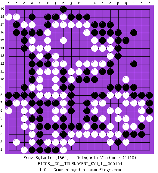 Last move : 1-0 2023 November 9 3:5:37 [Event "FICGS__GO__TOURNAMENT_KYU_I__000104"] [Site "FICGS"] [Date "2023.09.07"] [Round "1"] [Black "Praz,Sylvain"] [White "Osipyants,Vladimir"] [Result "1-0"] [Rating 1 "1664"] [Rating 2 "1110"] 1.r16 q4 2.c16 c4 3.o17 q10 4.e3 d6 5.h3 n3 6.c8 c7 7.d8 d3 8.e4 d2 9.e16 h17 10.r12 r7 11.r3 r4 12.q3 p3 13.p2 o2 14.p4 o3 15.s4 s5 16.s3 q2 17.r5 q5 18.r6 s6 19.q6 p5 20.r9 q8 21.q9 p8 22.p9 o8 23.o9 l16 24.n8 o6 25.e6 b7 26.d5 c5 27.d7 c6 28.f17 h15 29.l18 m14 30.n11 f14 31.d13 o14 32.p16 k12 33.b8 g10 34.d11 k3 35.k4 j3 36.j4 h2 37.h4 g2 38.k10 j11 39.q15 g8 40.h9 g9 41.j7 m6 42.s8 s7 43.m4 m3 44.f7 m12 45.m17 k17 46.f12 g13 47.h10 g11 48.f13 g12 49.g18 h18 50.p13 o13 51.o12 m11 52.m10 h8 53.j8 j10 54.j9 h7 55.j6 h6 56.l11 l12 57.a7 a6 58.a8 l4 59.l5 l3 60.m5 n5 61.l6 n7 62.m8 m7 63.l7 d14 64.c14 d15 65.c15 e13 66.e12 e14 67.k18 g17 68.f18 f15 69.m16 m15 70.e2 g3 71.g4 e10 72.d10 e9 73.d1 c1 74.e1 b2 75.n4 o4 76.h11 h12 77.j18 j17 78.h19 f16 79.p14 n12 80.o11 n16 81.n17 o15 82.o16 d17 83.d16 c17 84.b17 b18 85.b16 a18 86.d18 d9 87.c9 e11 88.d12 d4 89.e5 g5 90.r8 k11 91.l10 e8 92.e7 f8 93.t7 q7 94.t6 t5 95.t8 p6 96.n15 n14 97.h5 g6 98.f4 f11 99.n16 l17 100.p15 f2 101.f1 j2 102.g1 h1 103.g7 pass 104.pass 1-0 Sylvain Praz thanks for the game Follow this game move after move (download)Don't make empty triangles. (Anonymous) The best teachers teach from the heart, not from the book. (Author unknown)