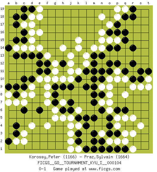 Last move : 0-1 2024 January 14 7:38:50 [Event "FICGS__GO__TOURNAMENT_KYU_I__000104"] [Site "FICGS"] [Date "2023.09.07"] [Round "1"] [Black "Korossy,Peter"] [White "Praz,Sylvain"] [Result "0-1"] [Rating 1 "1166"] [Rating 2 "1664"] 1.q16 d4 2.q4 d17 3.c15 e16 4.b17 o17 5.o16 n16 6.p17 o15 7.p16 n15 8.r14 d14 9.c18 c14 10.b15 f13 11.c6 c8 12.e6 f4 13.b4 c3 14.b3 b2 15.a2 c2 16.c10 d9 17.d10 f9 18.b13 g6 19.b8 b7 20.c9 d8 21.k3 r3 22.r4 q3 23.p3 p2 24.o3 o2 25.n2 n3 26.m2 p4 27.o4 p5 28.o5 o6 29.p6 q5 30.n6 o7 31.q6 r5 32.m5 q8 33.m8 o9 34.r10 r9 35.s10 s9 36.k10 q10 37.r12 n18 38.k13 k15 39.b9 c7 40.g8 f8 41.g7 f7 42.h6 g5 43.h12 h14 44.o12 p18 45.q18 q19 46.r19 p19 47.r18 d18 48.g9 j4 49.k5 k4 50.l4 j5 51.j6 j3 52.k2 k6 53.l5 g10 54.j9 h10 55.h9 j2 56.n10 o10 57.n11 c17 58.b18 b14 59.a14 t10 60.s11 j11 61.f11 f10 62.e12 j12 63.k12 k11 64.l11 j13 65.m13 h7 66.j7 l10 67.l9 l12 68.m11 l13 69.p14 m14 70.n13 g11 71.f12 g12 72.e13 e14 73.c13 a8 74.d19 e19 75.c19 e18 76.d13 d15 77.c16 j10 78.m10 k1 79.l1 j1 80.o1 q2 81.m3 e10 82.m12 k14 83.q11 p11 84.p12 n7 85.m7 n9 86.o11 p10 87.t11 t9 88.n8 o8 89.e11 p15 90.q15 d16 91.a9 a7 92.o14 n14 93.p1 n1 94.m1 s4 95.q1 r1 96.n1 h5 97.m9 pass 98.pass pass 0-1 Follow this game move after move (download)Connect with good shape. (Anonymous) Life is like a ten-speed bicycle: most of us have gears we never use. (Charles M. Schulz)