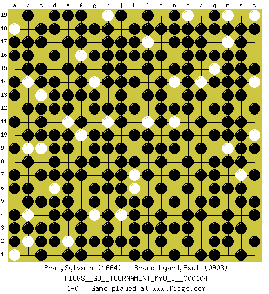 Last move : 1-0 2023 November 1 17:55:18 [Event "FICGS__GO__TOURNAMENT_KYU_I__000104"] [Site "FICGS"] [Date "2023.09.07"] [Round "1"] [Black "Praz,Sylvain"] [White "Brand Lyard,Paul"] [Result "1-0"] [Rating 1 "1664"] [Rating 2 "0903"] 1.q16 s4 2.d16 t10 3.d4 m5 4.f3 j10 5.r14 q11 6.q3 o9 7.n3 p6 8.s3 b2 9.r4 n16 10.p17 j1 11.d10 h8 12.f17 o1 13.k16 s7 14.c5 r1 15.k3 r9 16.s5 k6 17.c15 r17 18.r16 l8 19.o4 h14 20.h16 g7 21.d7 n13 22.d12 d2 23.f2 n11 24.o6 n8 25.p5 h5 26.h3 m1 27.m4 t14 28.s15 c9 29.d9 p14 30.n17 k13 31.p7 f6 32.q6 g11 33.n5 s12 34.l5 k7 35.m6 l14 36.m16 p2 37.o16 l2 38.n15 e14 39.d14 m11 40.e13 f10 41.f14 p8 42.q8 f5 43.e15 g1 44.f1 h19 45.p9 m19 46.o8 k18 47.o10 t1 48.n9 c19 49.m8 b7 50.b6 t6 51.t4 f19 52.n7 h9 53.l9 t19 54.k8 k9 55.l7 b11 56.k10 t9 57.j9 b14 58.b15 h13 59.j11 p12 60.h10 b4 61.c3 s2 62.j7 q9 63.j6 r19 64.k5 d1 65.c2 a17 66.c17 s6 67.r8 m13 68.s8 r5 69.r6 t12 70.s9 n2 71.m3 h18 72.m2 s11 73.q10 d6 74.c7 q13 75.r10 q4 76.p4 g4 77.h2 p19 78.r11 f12 79.p11 f9 80.q12 t17 81.s13 k15 82.j15 b9 83.o12 m10 84.q18 e8 85.c10 l17 86.l15 k12 87.k14 r2 88.q2 o18 89.n18 e18 90.f18 j4 91.k2 t3 92.t2 f4 93.p13 h11 94.j12 f16 95.e17 m12 96.j13 e5 97.d5 p3 98.e7 f8 99.e6 q15 100.q14 e3 101.e4 r7 102.d18 b13 103.a16 e11 104.c12 o14 105.f7 t8 106.r18 a1 107.c1 l11 108.h6 j17 109.m18 a8 110.b10 h7 111.g6 g3 112.g2 n14 113.g10 g13 114.h12 b17 115.g12 g15 116.f13 t16 117.s18 d11 118.c11 a5 119.b3 p1 120.q5 b18 121.e19 l1 122.n19 c8 123.d8 e10 124.q1 h17 125.l18 a10 126.b12 l13 127.j14 c13 128.a11 l4 129.k4 m15 130.l16 g14 131.e12 a14 132.r3 p15 133.s1 g19 134.c18 a13 135.a6 a19 136.t18 s2 137.f11 j19 138.l19 t15 139.h1 g8 140.q19 g17 141.g16 n1 142.k17 h11 143.f15 s16 144.s17 a15 145.b16 t13 146.r13 k19 147.k1 r1 148.r2 o3 149.l3 j18 150.r15 e2 151.o2 o1 152.n1 k11 153.h15 g14 154.h4 p3 155.g5 f5 156.a3 s14 157.a7 h13 158.b8 g18 159.a9 m1 160.l1 o19 161.a2 c9 162.j5 t11 163.f4 r9 164.d19 a18 165.b19 a18 166.a4 o11 167.b5 t5 168.o17 b18 169.b17 c14 170.q7 t7 171.s10 l12 172.r12 s12 173.t12 t14 174.t15 s7 175.t7 t10 176.t9 t6 177.s6 n12 178.t5 t11 179.s11 t10 180.n10 m14 181.o13 l10 182.o15 t16 183.p16 p2 184.p1 a12 185.d13 b14 186.a13 c13 187.a14 j3 188.j2 t13 189.m9 m10 190.m11 n13 191.m13 l12 192.m12 n14 193.m14 n11 194.n12 l14 195.l13 p14 196.o14 l11 197.l10 n14 198.j16 j18 199.h18 g17 200.h17 g19 201.g18 h19 202.j8 k13 203.g9 j19 204.e9 h8 205.k18 k19 206.j17 f10 207.f19 h19 208.j19 g8 209.f8 k11 210.k12 g7 211.h14 a19 212.a17 e11 213.e10 l11 214.e1 f6 215.c14 a18 216.d3 e2 217.h9 j4 218.d2 t17 219.h7 q15 220.g13 b9 221.p18 o19 222.e5 h8 223.g8 p19 224.s14 g4 225.s16 t14 226.o18 o19 227.o3 1-0 Follow this game move after move (download)If White takes all four corners, Black should resign; if Black takes all four corners, Black should also resign. (David Kent) Wisdom doesn't necessarily come with age. Sometimes age just shows up all by itself. (Tom Wilson)