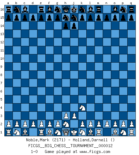 Last move : 1-0 2007 October 10 0:9:54 [Event "FICGS__BIG_CHESS__TOURNAMENT__000012"] [Site "FICGS"] [Date "2007.09.08"] [Round "1"] [White "Noble,Mark"] [Black "Holland,Darnell"] [Result "1-0"] [WhiteElo "2171"] [BlackElo ""] 1.j2-k4 1-0 This big chess game has been lost on time (started : 2007.09.08 1:54:3) Follow this game move after move (download)I'm not afraid of Spassky. The world knows I'm the best. You don't need a match to prove it. (Bobby Fischer) Ohne Fehler kann es keine Brillanz geben. (Emanuel Lasker) Las leyes del Ajedrez no permiten una libre elección: tienes que mover quieras o no. (Emanuel Lasker) Avant la finale, les dieux ont créé le milieu de partie. (Tarrasch) I feel so... helpless. (C-3PO in Star Wars ep.3)