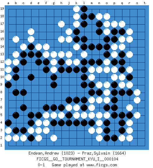 Last move : 0-1 2024 January 24 22:20:17 [Event "FICGS__GO__TOURNAMENT_KYU_I__000104"] [Site "FICGS"] [Date "2023.09.07"] [Round "1"] [Black "Endean,Andrew"] [White "Praz,Sylvain"] [Result "0-1"] [Rating 1 "1023"] [Rating 2 "1664"] 1.q4 d16 2.d4 r16 3.p16 p17 4.q16 q17 5.n16 o16 6.o15 o17 7.n14 q14 8.p15 r15 9.k16 c14 10.d10 f3 11.c6 d3 12.c3 c2 13.b3 e4 14.d5 r6 15.o3 q9 16.q11 p13 17.n12 p11 18.p12 o12 19.q12 o11 20.o13 q10 21.q13 p14 22.o14 n11 23.m12 m11 24.l12 m3 25.k4 m5 26.e5 f5 27.f6 g5 28.g6 h5 29.h6 k5 30.j5 j6 31.j4 k6 32.d2 e3 33.j7 e2 34.k7 m6 35.l7 h17 36.c12 h15 37.l11 b2 38.m4 n4 39.l4 n3 40.l6 l5 41.h4 g2 42.p6 o5 43.p5 r3 44.q3 r4 45.r5 s5 46.q5 s7 47.o6 m7 48.m8 n7 49.n8 o7 50.o4 n5 51.p8 o8 52.l9 n2 53.o2 q2 54.p2 r2 55.p7 o9 56.p9 p10 57.d14 d15 58.d13 h13 59.h11 k18 60.n17 n18 61.m18 o18 62.l18 k17 63.l17 j16 64.k15 b15 65.c8 b12 66.b11 b13 67.c13 a11 68.b10 a3 69.a4 a2 70.b5 a10 71.a9 a12 72.b8 f14 73.e13 g12 74.h12 f13 75.f11 j13 76.k13 j12 77.j11 k12 78.k11 k14 79.l14 l13 80.m14 k19 81.l19 r13 82.r10 r11 83.q8 r9 84.r8 s8 85.f12 e14 86.e12 j15 87.l15 m10 88.l10 g11 89.g10 g13 90.g9 n9 91.m9 q15 92.g4 f4 0-1 Follow this game move after move (download)If you have lost four corners, resign. (Anonymous) The next best thing to gambling and winning is gambling and loosing. (Nick Dandalos)