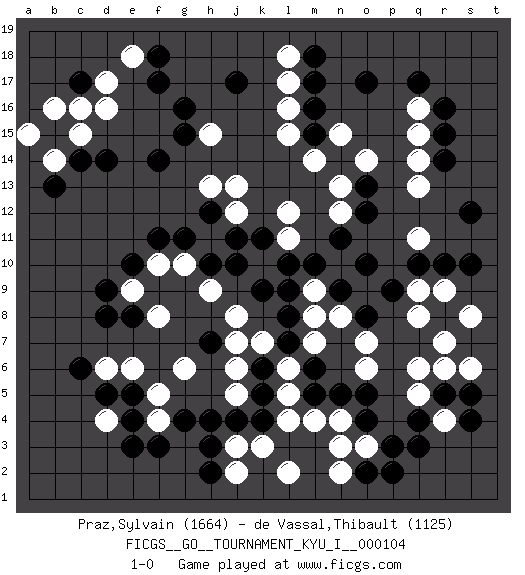 Last move : 1-0 2024 March 2 23:24:37 [Event "FICGS__GO__TOURNAMENT_KYU_I__000104"] [Site "FICGS"] [Date "2023.09.07"] [Round "1"] [Black "Praz,Sylvain"] [White "de Vassal,Thibault"] [Result "1-0"] [Rating 1 "1664"] [Rating 2 "1125"] 1.r16 d16 2.q3 d4 3.o17 q16 4.q17 q15 5.r15 q14 6.r14 q13 7.s12 q11 8.f17 q5 9.r5 r4 10.q4 r6 11.s5 s6 12.s4 q6 13.o4 o6 14.c14 c15 15.d14 e18 16.f18 n15 17.f14 l15 18.c17 d17 19.b15 c16 20.c6 e6 21.d8 f8 22.f3 f4 23.g4 h13 24.e4 f5 25.e3 j5 26.m5 l6 27.m6 m7 28.l7 m8 29.k6 l5 30.k5 l4 31.k4 m4 32.n5 n4 33.o5 k7 34.l8 k3 35.j4 j3 36.h3 k10 37.l9 n10 38.l10 l11 39.n9 o9 40.k11 j6 41.h4 j8 42.j10 l12 43.k9 h9 44.g11 g6 45.e10 g10 46.f11 h11 47.h10 f10 48.h12 j12 49.j11 o3 50.o2 n2 51.p3 n3 52.h2 l2 53.p2 j2 54.e5 d6 55.d5 b16 56.o8 o7 57.o10 m9 58.p9 n8 59.m10 o9 60.h7 j7 61.n9 r9 62.n11 n12 63.r8 q8 64.r10 q9 65.q10 r7 66.s10 s8 67.m16 l16 68.m17 l17 69.g16 j13 70.o12 n13 71.o13 o14 72.m15 m14 73.m18 l18 74.j17 h15 75.g15 e9 76.d9 b14 77.b13 a15 78.e8 1-0 Follow this game move after move (download)Six eyes in a rectangle are alive. (Anonymous) Looking at the proliferation of personal web pages on the Net, it looks like very soon everyone on Earth will have 15 megabytes of fame. (M.G. Sriram)