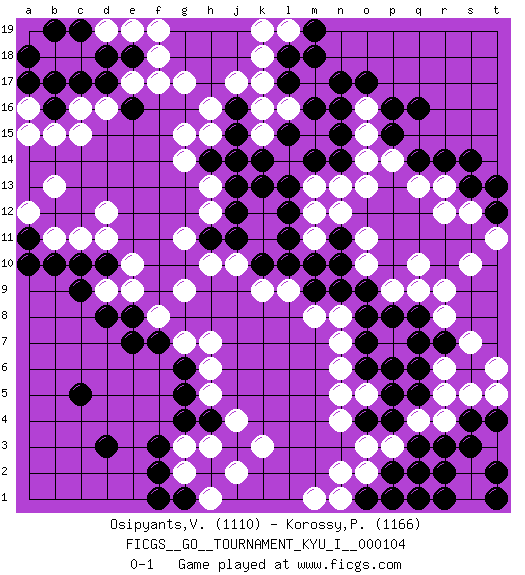 Last move : 0-1 2024 January 10 4:51:38 [Event "FICGS__GO__TOURNAMENT_KYU_I__000104"] [Site "FICGS"] [Date "2023.09.07"] [Round "1"] [Black "Osipyants,Vladimir"] [White "Korossy,Peter"] [Result "0-1"] [Rating 1 "1110"] [Rating 2 "1166"] 1.q16 q4 2.d3 d16 3.c5 g3 4.d10 q10 5.r14 k16 6.n17 g17 7.c17 c16 8.d17 e17 9.e18 f18 10.e16 f17 11.b16 b15 12.b17 c15 13.d18 d12 14.e7 k3 15.r3 r4 16.q3 p3 17.p2 o2 18.p4 o3 19.s4 s5 20.s3 r6 21.q2 s2 22.t2 r12 23.q8 r8 24.q7 r9 25.p6 n7 26.o7 n6 27.o8 n8 28.o9 o11 29.n9 l9 30.n11 o10 31.n10 n12 32.l10 m12 33.l11 k9 34.j11 h13 35.k13 g9 36.g6 h7 37.l12 o13 38.l15 k15 39.m14 o15 40.n16 o16 41.o17 c11 42.c10 h6 43.g5 h5 44.g4 h3 45.f3 g11 46.j14 h15 47.h14 g14 48.j15 h16 49.l18 k18 50.l17 k17 51.h4 j4 52.q5 r5 53.o4 n4 54.k14 h12 55.b10 b11 56.a11 a12 57.a10 b13 58.f2 g2 59.g1 h1 60.f1 j2 61.p16 q13 62.q14 p14 63.s13 s12 64.p15 e9 65.d8 e10 66.m9 m8 67.n15 o14 68.r7 s7 69.q6 o5 70.p5 t6 71.t4 t5 72.o1 s1 73.r1 p1 74.n1 n2 75.q1 m1 76.r2 l16 77.m16 l19 78.m19 k19 79.m18 f8 80.f7 d9 81.c9 j10 82.k10 h10 83.j12 m11 84.m10 m13 85.l13 g7 86.t12 t11 87.t13 s10 88.o6 n5 89.n14 r13 90.s14 p9 91.j16 j17 92.h11 e19 93.b19 n13 94.p8 q9 95.t1 p1 96.o1 d11 97.e8 a16 98.a18 d19 99.c19 f19 100.j13 g15 101.p1 n1 102.a17 a15 103.pass pass 0-1 Follow this game move after move (download)When you study joseki, you lose two stones in strength. (Anonymous) Before all elsed, be armed. (Niccolo Machiavelli)