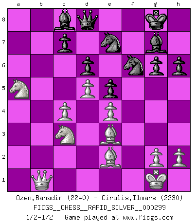 Last move : 1/2-1/2 2023 September 18 9:49:43 [Event "FICGS__CHESS__RAPID_SILVER__000299"] [Site "FICGS"] [Date "2023.09.08"] [Round "1"] [White "Ozen,Bahadir"] [Black "Cirulis,Ilmars"] [Result "1/2-1/2"] [WhiteElo "2240"] [BlackElo "2230"] 1.c4 d6 2.d4 Nf6 3.Nc3 g6 4.e4 Bg7 5.Nf3 O-O 6.Be2 e5 7.O-O Nc6 8.d5 Ne7 9.b4 a5 10.bxa5 Rxa5 11.a4 Nd7 12.Nd2 f5 13.Nb3 Ra8 14.f3 b6 15.a5 bxa5 16.Rxa5 Rxa5 17.Nxa5 fxe4 18.fxe4 Rxf1+ 19.Qxf1 h6 20.Be3 Nf6 21.Qb1 1/2-1/2 Follow this game move after move (download)Becoming successful at Chess allows you to discover your own personality. That's what I want for the kids I teach. (Saudin Robovic) Matt entspricht nicht immer den Tatsachen. (Savielly Grigorievitsch Tartakower) No nos podemos resistir a la fascinación de un sacrificio ya que la pasión por los sacrificios es parte de la naturaleza de un jugador de Ajedrez. (Rudolf Spielman) Même si l'adversaire joue le coup analysé précédemment, recommencez l'analyse en voyant la nouvelle position. Première règle de Blumenfeld Whenever people agree with me, I always feel I must be wrong. (Oscar Wilde)