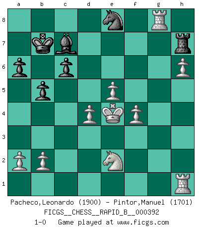 Last move : 1-0 2023 September 27 19:35:11 [Event "FICGS__CHESS__RAPID_B__000392"] [Site "FICGS"] [Date "2023.09.11"] [Round "1"] [White "Pacheco,Leonardo"] [Black "Pintor,Manuel"] [Result "1-0"] [WhiteElo "1900"] [BlackElo "1701"] 1.d4 d5 2.c4 c6 3.Nc3 Nf6 4.Nf3 Bf5 5.cxd5 Nxd5 6.Qb3 Qb6 7.Qxb6 Nxb6 8.e4 Bg4 9.Ne5 Bh5 10.g4 Bg6 11.h4 h5 12.Be2 hxg4 13.Nxg6 fxg6 14.Bxg4 N8d7 15.Be6 O-O-O 16.Bg5 a6 17.O-O-O Kb8 18.f3 Nf6 19.Ne2 Nh5 20.Kc2 Ka8 21.Bf7 Rd6 22.e5 Rd5 23.Bxg6 e6 24.Bf7 Ra5 25.Bxe6 Nd5 26.Bxd5 Rxd5 27.Nc3 Ra5 28.Bd8 Bb4 29.Bxa5 Bxa5 30.Ne2 Rf8 31.f4 b5 32.Kd3 Bc7 33.Ke4 Kb7 34.Rdg1 Rf7 35.Rg5 g6 36.Rxg6 Ng7 37.h5 Ne8 38.h6 Rh7 39.Rg8 1-0 Follow this game move after move (download)White lost because he failed to remember the right continuation and had to think up the moves himself. (Siegbert Tarrasch) Sitze auf Deine Hände. (Siegbert Tarrasch) La esencia del Ajedrez es pensar acerca de lo que el Ajedrez es. (David Bronstein) Aux échecs, l'amour-propre est satisfait quand on remporte la victoire, mais il n'y a pas de honte à être battu. (Benjamin Franklin) Every vice is only an exaggeration of a necessary and virtuous function. (Ralph Waldo Emerson, Journals 1936)