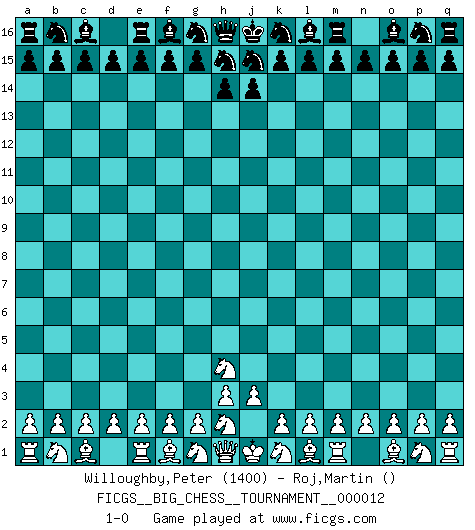 Last move : 1-0 2007 October 8 12:0:38 [Event "FICGS__BIG_CHESS__TOURNAMENT__000012"] [Site "FICGS"] [Date "2007.09.08"] [Round "1"] [White "Willoughby,Peter"] [Black "Roj,Martin"] [Result "1-0"] [WhiteElo "1400"] [BlackElo ""] 1.j2-h4 1-0 This big chess game has been lost on time (started : 2007.09.08 1:54:3) Follow this game move after move (download)Chess is no whit inferior to the violin, and we have a large number of professional violinists. (Mikhail Botvinnik) Schach verlangt totale Konzentration. (Robert James Fischer) En el Ajedrez, tal como es jugado por los Maestros, practicamente la suerte es eliminada. (Emanuel Lasker) Votre seul travail dans les ouvertures est d'obtenir un milieu de partie jouable. (Lajos Portish) The beginning of wisdom is silence. The second step is listening. (Unknown)