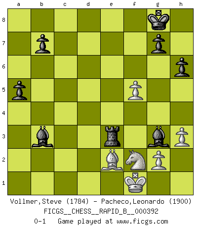 Last move : 0-1 2023 October 8 21:30:23 [Event "FICGS__CHESS__RAPID_B__000392"] [Site "FICGS"] [Date "2023.09.11"] [Round "1"] [White "Vollmer,Steve"] [Black "Pacheco,Leonardo"] [Result "0-1"] [WhiteElo "1784"] [BlackElo "1900"] 1.e4 c5 2.Nf3 d6 3.d4 cxd4 4.Nxd4 Nf6 5.Nc3 a6 6.Be2 e5 7.Nf3 h6 8.a4 Be7 9.O-O O-O 10.h3 Be6 11.Be3 Nc6 12.Qd2 Rc8 13.Rac1 d5 14.exd5 Nxd5 15.Nxd5 Bxd5 16.c4 Be6 17.Qxd8 Rfxd8 18.Bb6 e4 19.Nh2 Rd2 20.Rfe1 Rxb2 21.Be3 Bb4 22.Rb1 Ra2 23.Ra1 Rxa4 24.Rxa4 Bxe1 25.f3 Ne5 26.c5 Nd7 27.Kf1 Bg3 28.Ng4 Nxc5 29.Rb4 a5 30.Rb1 f5 31.Nf2 Nb3 32.fxe4 Rc3 33.exf5 Rxe3 34.Rxb3 Bxb3 0-1 Follow this game move after move (download)The beauty of a move lies not in its' appearance but in the thought behind it. (Siegbert Tarrasch) Ich verstehe mehr vom Schach als irgendein anderer lebender Meister. (José Raúl Capablanca) El Ajedrez, como la música, como el amor, tiene el poder de hacer feliz a la gente. (Siegbert Tarrasch) Dieu déplace le joueur, et celui-ci la pièce. Quel Dieu derrière Dieu commence donc la trame ? Arturo Perez-Reverte (prix de littérature policière 1993). Faith : not wanting to know what is true. (Friedrich Nietzsche)