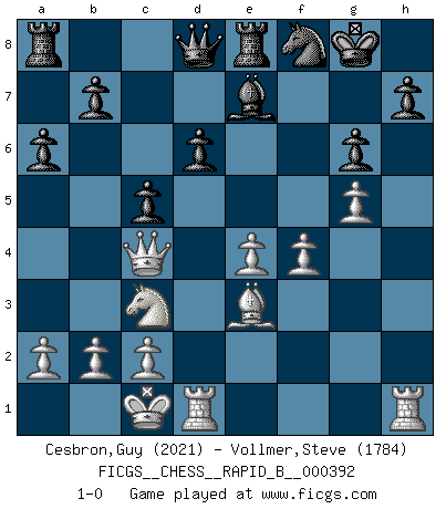 Last move : 1-0 2023 October 21 12:37:32 [Event "FICGS__CHESS__RAPID_B__000392"] [Site "FICGS"] [Date "2023.09.11"] [Round "1"] [White "Cesbron,Guy"] [Black "Vollmer,Steve"] [Result "1-0"] [WhiteElo "2021"] [BlackElo "1784"] 1.e4 e5 2.Nf3 Nc6 3.d4 exd4 4.Nxd4 Nxd4 5.Qxd4 d6 6.Nc3 Nf6 7.f3 Be7 8.Be3 Be6 9.O-O-O O-O 10.g4 c5 11.Qd2 a6 12.g5 Nd7 13.f4 Bg4 14.Be2 Bxe2 15.Qxe2 g6 16.h4 Re8 17.h5 Nf8 18.hxg6 fxg6 19.Qc4+ 1-0 Follow this game move after move (download)Chess is a fairy tale of 1001 blunders. (Savielly Tartakower) Im Reiche der Wirklichkeit ist man nie so glücklich wie im Reiche der Gedanken. (Arthur Schopenhauer) Hoy en día, si tu no eres un Gran Maestro a los 14 años, es mejor que lo olvides. (Anand Viswanathan) On peut tirer plus d'utilité d'une partie perdue que de 100 parties gagnées. (Capablanca) Macintosh - we might not get everything right, but at least we knew the century was going to end. (Douglas Adams)