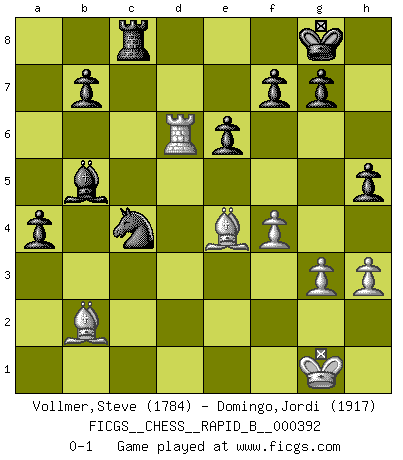 Last move : 0-1 2023 November 5 9:32:9 [Event "FICGS__CHESS__RAPID_B__000392"] [Site "FICGS"] [Date "2023.09.11"] [Round "1"] [White "Vollmer,Steve"] [Black "Domingo,Jordi"] [Result "0-1"] [WhiteElo "1784"] [BlackElo "1917"] 1.d4 d5 2.c4 dxc4 3.e3 Nf6 4.Nf3 e6 5.Bxc4 c5 6.O-O a6 7.dxc5 Bxc5 8.Qe2 Nc6 9.Nc3 Qc7 10.a4 O-O 11.e4 Ng4 12.g3 Nge5 13.Nxe5 Nxe5 14.Bb3 Qb6 15.Bc2 Bd7 16.h3 Bd4 17.a5 Qb4 18.Rd1 Bxc3 19.bxc3 Qxc3 20.Ra3 Bb5 21.Rxc3 Bxe2 22.Rd6 Rac8 23.Rxc8 Rxc8 24.f4 Nc4 25.Rd7 Nxa5 26.Bd2 Bb5 27.Rd4 Nc6 28.Rd6 a5 29.e5 a4 30.Bc1 h5 31.Be4 Nxe5 32.Bb2 Nc4 0-1 Follow this game move after move (download)Chess is the gymnasium of the mind. (Blaise Pascal) Obwohl ich vom Stil her kaum zu den Priestern der Schachkunst gezählt werde, halte ich Schach doch für eine Kunst. (Tigran Petrosjan) Aquellos que dicen entender al Ajedrez, no entienden nada. (Robert Hubner) Des idées, des idées, j'en ai cent, j'en ai mille. Des bonnes, des mauvaises, applicables, irréalisables... Il suffit de faire le tri ! (Roos) Whoever said the pen is mightier than the sword obviously never encountered automatic weapons. (US General Douglas MacArthur)