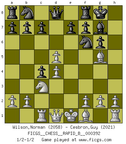 Last move : 1/2-1/2 2023 October 2 2:45:52 [Event "FICGS__CHESS__RAPID_B__000392"] [Site "FICGS"] [Date "2023.09.11"] [Round "1"] [White "Wilson,Norman"] [Black "Cesbron,Guy"] [Result "1/2-1/2"] [WhiteElo "2058"] [BlackElo "2021"] 1.d4 Nf6 2.c4 g6 3.Nf3 Bg7 4.Nc3 d5 5.Bf4 O-O 6.Rc1 dxc4 7.e3 Be6 8.Ng5 Bd5 9.e4 h6 10.exd5 hxg5 11.Bxg5 1/2-1/2 Follow this game move after move (download)The Chess pieces are the block alphabet which shapes thoughts; and these thoughts, although making a visual design on the chessboard, express their beauty abstractly, like a poem. (Marcel Duchamp) Karpov ist ein Museumsstück. (Garry Kasparov) Cada Peón es potencialmente una Reina. (James Mason) Les échecs, c'est la lutte contre l'erreur. (Johannes Zukertort) Horse racing is animated roulette. (Roger Kahn)