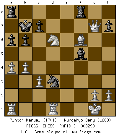 Last move : 1-0 2023 November 11 5:38:49 [Event "FICGS__CHESS__RAPID_C__000299"] [Site "FICGS"] [Date "2023.09.17"] [Round "1"] [White "Pintor,Manuel"] [Black "Nurcahyo,Dery"] [Result "1-0"] [WhiteElo "1701"] [BlackElo "1663"] 1.e4 e5 2.f4 d6 3.Nf3 Nc6 4.c3 Nf6 5.Bc4 a6 6.a4 Nxe4 7.d3 Nf6 8.O-O Na5 9.fxe5 dxe5 10.Bxf7+ Kxf7 11.Nxe5+ Kg8 12.b4 Bd6 13.Nf3 Nc6 14.Ng5 Qe7 15.Re1 Qd7 16.Qb3+ Kf8 17.Ne6+ Kg8 18.Ng5 Kf8 19.Ne6+ Ke8 20.Nc5 Kd8 21.Nxd7 Bxd7 22.Qf7 Rf8 23.Qxg7 Ne5 24.Bg5 Nxd3 25.Bxf6+ Kc8 26.Rd1 Bf5 27.Nd2 b6 28.Nc4 Kb7 29.Nxd6+ 1-0 Follow this game move after move (download)Life is like a game of Chess, changing with each move. (Chinese proverb) Wenn ich Weiß habe gewinne ich weil ich Weiß habe, wenn ich Schwarz habe gewinne ich weil ich Bogoljubov bin. (Efim Bogoljubov) El Ajedrez lo es todo: arte, ciencia y deporte. (Anatoly Karpov) Aux échecs, l'amour-propre est satisfait quand on remporte la victoire, mais il n'y a pas de honte à être battu. (Benjamin Franklin) Yoga is 99% practice and 1% knowledge. (Sri Krishna Pattabhi Jois)