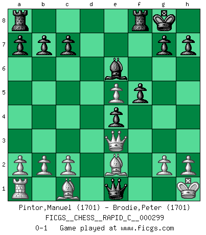 Last move : 0-1 2023 October 30 13:39:41 [Event "FICGS__CHESS__RAPID_C__000299"] [Site "FICGS"] [Date "2023.09.17"] [Round "1"] [White "Pintor,Manuel"] [Black "Brodie,Peter"] [Result "0-1"] [WhiteElo "1701"] [BlackElo "1701"] 1.e4 e6 2.f4 d5 3.exd5 exd5 4.d4 f5 5.Nf3 Nf6 6.Bd3 Bd6 7.Ne5 O-O 8.O-O Be6 9.Nc3 Nbd7 10.Qf3 Ne4 11.Qh5 Ndf6 12.Qh3 Bxe5 13.fxe5 Ng4 14.Nxe4 dxe4 15.Be2 Qxd4+ 16.Kh1 Nf2+ 17.Rxf2 Qxf2 18.Qe3 Qe1+ 0-1 Follow this game move after move (download)Bobby Fischer's current state of mind is indeed a tragedy. One of the world's greatest Chess players - the pride and sorrow of American Chess. (Frank Brady) Je älter ich werde, um so mehr schätze ich die Bauern. (Paul Keres) Una buena ofensiva y una buena defensa, comienzan ambas con un buen desarrollo. (Bruce A. Moon) Nous vivons dans un monde échiquéen : chaque jour qui passe est un défi à relever. (Philosophe Sasha) That's absurd. I love it. (Gregory House, House M.D.)