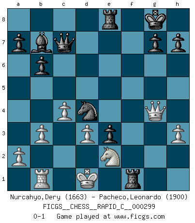 Last move : 0-1 2023 December 27 4:58:34 [Event "FICGS__CHESS__RAPID_C__000299"] [Site "FICGS"] [Date "2023.09.17"] [Round "1"] [White "Nurcahyo,Dery"] [Black "Pacheco,Leonardo"] [Result "0-1"] [WhiteElo "1663"] [BlackElo "1900"] 1.c4 c5 2.Nf3 Nc6 3.Nc3 e5 4.d3 f5 5.Bg5 Be7 6.Bd2 Nf6 7.h3 d5 8.b3 d4 9.Na4 e4 10.Nh2 e3 11.fxe3 Ne4 12.g3 Qc7 13.Rg1 Bd6 14.Qc2 Bxg3+ 15.Kd1 Nxd2 16.Qxd2 Bxh2 17.Rg2 O-O 18.Nxc5 Be5 19.Rb1 dxe3 20.Qe1 b6 21.Na4 Bb7 22.Nc3 Nd4 23.Rg5 Rae8 24.Qh4 Bf6 25.Qg3 f4 26.Qg1 Bxg5 27.Qxg5 f3 28.Qg4 fxe2+ 29.Nxe2 Rxf1+ 0-1 Follow this game move after move (download)Chess is a terrible game. If you have no center, your opponent has a freer position. If you do have a center, then you really have something to worry about ! (Siegbert Tarrasch) Wenn ich einen Club besuche, sind die Spieler stumm vor Staunen. (José Raúl Capablanca) Combinaciones deslumbrantes son para la mayoría, mover madera es para los pocos. (Georg Kieninger) D'abord les bases : Jouez et étudiez, puis étudiez et jouez, ensuite jouez et étudiez, puis étudiez et jouez. Deuxièmement : Donnez toujours le meilleur de vous-même ! (Ken Smith) Political correctness is subjecting us to gross incompetence. (Johann Piek)