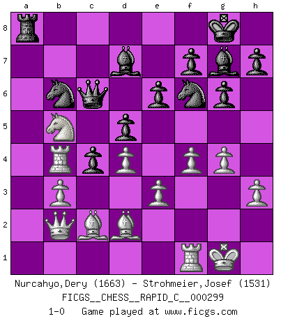 Last move : 1-0 2023 December 18 19:17:57 [Event "FICGS__CHESS__RAPID_C__000299"] [Site "FICGS"] [Date "2023.09.17"] [Round "1"] [White "Nurcahyo,Dery"] [Black "Strohmeier,Josef"] [Result "1-0"] [WhiteElo "1663"] [BlackElo "1531"] 1.f4 d5 2.e3 g6 3.Bb5+ c6 4.Ba4 b5 5.Bb3 Bg7 6.Nc3 Nf6 7.Nf3 O-O 8.O-O Nbd7 9.d4 a5 10.a3 e6 11.Ne2 c5 12.c3 c4 13.Bc2 Rb8 14.h3 b4 15.axb4 axb4 16.cxb4 Rxb4 17.Ne5 Nh5 18.Nc6 Qb6 19.Nxb4 Qxb4 20.Ra4 Qe7 21.g4 Nhf6 22.Bd2 Nb6 23.Rb4 Qc7 24.Nc3 Bd7 25.b3 Ra8 26.Qb1 Qd6 27.Nb5 Qc6 28.Qb2 1-0 This chess game has been lost on time (started : 2023.09.17 20:43:51) Follow this game move after move (download)The mistakes are there, waiting to be made. (Savielly Tartakower) Wer der Ansicht ist, daß alle Schachspieler verrückt sind, wird durch Studium des Lebens von Emil Josef Diemer nicht auf andere Gedanken kommen. (Hans Ree) El Ajedrez tiene tanto misterio como las mujeres. (Purdy) Les échecs, c'est l'art d'analyser. (Mikhail Botvinnik) Life is like a game of cards: the hand you are dealt represents determinism; the way you play it is free will. (Jawaharlal Nehru)