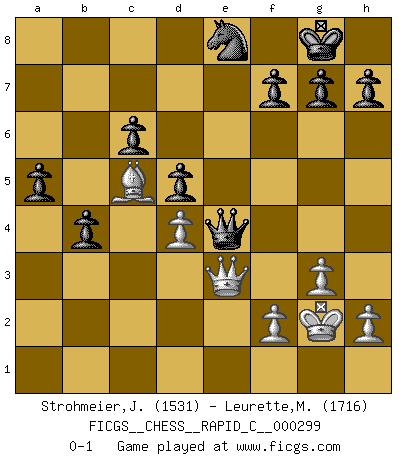 Last move : 0-1 2023 December 7 23:48:28 [Event "FICGS__CHESS__RAPID_C__000299"] [Site "FICGS"] [Date "2023.09.17"] [Round "1"] [White "Strohmeier,Josef"] [Black "Leurette,Marc-Antoine"] [Result "0-1"] [WhiteElo "1531"] [BlackElo "1716"] 1.e4 e5 2.Nf3 Nc6 3.Bb5 Nf6 4.O-O Nxe4 5.Re1 Nd6 6.Bf1 Be7 7.Nxe5 Nxe5 8.Rxe5 O-O 9.d4 b6 10.Re1 Bb7 11.g3 Bf6 12.Bg2 Bxg2 13.Kxg2 Nf5 14.c3 d5 15.Qf3 Ne7 16.Na3 Re8 17.Bd2 Qd7 18.Nc2 c6 19.Re2 a5 20.Rae1 Kf8 21.Ne3 b5 22.Ng4 Ng8 23.Ne5 Bxe5 24.Rxe5 Nf6 25.Bf4 Rxe5 26.Bxe5 Re8 27.Kf1 Qh3+ 28.Qg2 Qf5 29.Bd6+ Kg8 30.Rxe8+ Nxe8 31.Bc5 Qb1+ 32.Ke2 Qxb2+ 33.Kf3 Qxc3+ 34.Ke2 Qc2+ 35.Kf1 Qxa2 36.Qf3 Qb1+ 37.Kg2 b4 38.Qe3 Qe4+ 0-1 Follow this game move after move (download)Pawn endings are to Chess what putting is to golf. (Cecil Purdy) Fischer: 'Remis!?' Uhlmann: 'Aber es muss doch dreimal Zugwiederholung sein!' Fischer: 'Sie nehmen das Remis an, wie ich es sage, sonst spiele ich weiter und werde Sie dann schlagen!' (Robert James Fischer) El muchacho (en ese entonces un niño de 12 años llamado Anatoly Karpov) no tiene ni idea de lo que es el Ajedrez y no hay futuro en absoluto para el en esta profesión. (Mikhail Botvinnik) Il n'y a plus de joueurs du niveau de Jacob Murray dont la seule quête est le beau jeu, le plaisir de voir les pièces construire quelque chose. Sur 10 idées à la minute, 9 seront sans intérêt, la dernière s'avèrera géniale. (Christian Bauer) Before all elsed, be armed. (Niccolo Machiavelli)