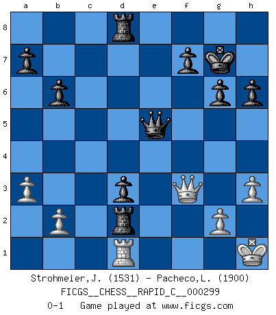 Last move : 0-1 2024 January 24 23:56:22 [Event "FICGS__CHESS__RAPID_C__000299"] [Site "FICGS"] [Date "2023.09.17"] [Round "1"] [White "Strohmeier,Josef"] [Black "Pacheco,Leonardo"] [Result "0-1"] [WhiteElo "1531"] [BlackElo "1900"] 1.e4 c5 2.Nf3 e6 3.d4 cxd4 4.Nxd4 Nf6 5.Nc3 Nc6 6.a3 Be7 7.Be2 O-O 8.O-O d6 9.Bg5 h6 10.Bh4 Nxd4 11.Qxd4 Nxe4 12.Bxe7 Nxc3 13.Qxc3 Qxe7 14.Rad1 Rd8 15.Qb4 b6 16.Bf3 Rb8 17.c4 Bb7 18.Bxb7 Rxb7 19.Rd2 d5 20.Qb3 d4 21.f4 e5 22.fxe5 Qxe5 23.Rd3 Rc7 24.Rfd1 Qe6 25.h3 Rxc4 26.Rf3 Rc7 27.Qd3 Qd6 28.Rf2 g6 29.Rfd2 Qe5 30.Qf3 Kg7 31.Re2 Qc5 32.Kh1 Re7 33.Red2 Re3 34.Qf2 d3 35.Rf1 Qe7 36.Rfd1 Qe5 37.Qf1 Re2 38.Qf3 Rxd2 0-1 Follow this game move after move (download)Bobby is the finest Chess player this country ever produced. His memory for the moves, his brilliance in dreaming up combinations, and his fierce determination to win are uncanny. (John Collins) Schach ist Kampf, hauptsächlich jedoch gegen die eigenen Fehler. (Savielly Grigorievitsch Tartakower) Con el fin de mejorar tu juego, debes de estudiar los finales antes que todo, ya que mientras que los finales pueden ser estudiados y dominados por sí mismos, el juegomedio y la apertura deben de ser estudiados en relación con los finales. (José Raúl Capablanca) Plusieurs personnes se sont demandées comment Tal faisait pour gagner... En fait, c'est très simple ! Il met ses pièces au centre de l'échiquier et les sacrifie quelque part ! (David Bronstein) Memory is a complicated thing, a relative to truth, but not its twin. (Barbara Kingsolver, Animal Dreams)