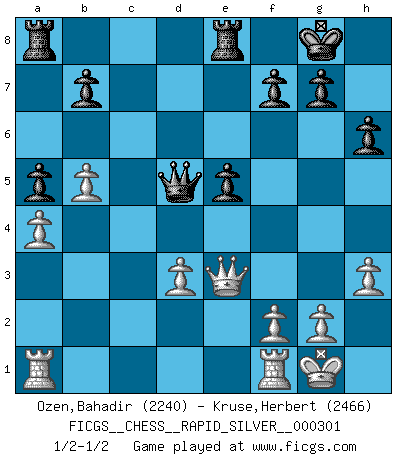 Last move : 1/2-1/2 2023 October 13 14:39:8 [Event "FICGS__CHESS__RAPID_SILVER__000301"] [Site "FICGS"] [Date "2023.09.18"] [Round "1"] [White "Ozen,Bahadir"] [Black "Kruse,Herbert"] [Result "1/2-1/2"] [WhiteElo "2240"] [BlackElo "2466"] 1.c4 e5 2.Nc3 Nf6 3.Nf3 Nc6 4.e4 Bb4 5.d3 d6 6.a3 Bc5 7.b4 Bb6 8.Be3 O-O 9.Be2 Bg4 10.O-O Bxf3 11.Bxf3 Nd4 12.Na4 Nxf3+ 13.Qxf3 Bxe3 14.Qxe3 Re8 15.Nc3 c6 16.h3 a5 17.b5 d5 18.cxd5 cxd5 19.Nxd5 Nxd5 20.exd5 Qxd5 21.a4 h6 1/2-1/2 Follow this game move after move (download)Chess is played with the mind and not with the hands ! (Renaud and Kahn) Ich verstehe Aljechins Kombinationen ganz gut; aber woher er diese Angriffschancen bekommt und wie er die Eröffnung behandelt das ist für mich ein Buch mit sieben Siegeln. (Rudolf Spielmann) Solo los afeminados hacen el Enroque. (Rob Sillars) Demandez au pauvre Cg1 ce qu'il en pense. Eduard Gufeld à propos de la variante Saemisch de l'Est-Indienne. The Movers & Shakers of this world are those who play chess in the mornings and go to the disco in the evenings. (Dinesh De Silva)