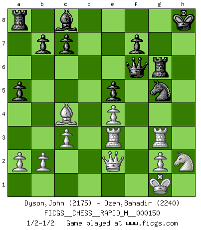 Last move : 1/2-1/2 2023 October 23 22:1:58 [Event "FICGS__CHESS__RAPID_M__000150"] [Site "FICGS"] [Date "2023.09.22"] [Round "1"] [White "Dyson,John"] [Black "Ozen,Bahadir"] [Result "1/2-1/2"] [WhiteElo "2175"] [BlackElo "2240"] 1.e4 e5 2.Nf3 Nc6 3.Bc4 Bc5 4.d3 Nf6 5.c3 d6 6.O-O a5 7.Re1 O-O 8.Bg5 h6 9.Bh4 Ba7 10.Nbd2 g5 11.Bg3 Nh7 12.h3 Qf6 13.Nf1 h5 14.Ne3 Bxe3 15.Rxe3 Ne7 16.h4 g4 17.Nh2 Ng6 18.f3 Nxh4 19.fxg4 hxg4 20.Nxg4 Qg5 21.Bxh4 Qxh4 22.Nh2 Kh8 23.d4 Qh6 24.Qd3 Rg8 25.Rae1 Ng5 26.Rg3 Rg7 27.dxe5 dxe5 28.R1e3 Qf6 29.Qe2 Rg6 30.Kh1 Rh6 31.Kg1 Rg6 1/2-1/2 Follow this game move after move (download)Personally, I rather look forward to a computer program winning the world Chess Championship. Humanity needs a lesson in humility. (Richard Dawkings) Jeder weiß, dass Gasprom Putins persönliches Machtinstrument ist. Die Firma wird vom Kreml aus geleitet und wird schon deshalb nie transparent sein. (Garry Kasparov) El Ajedrez es un juego de pelea el cual es puramente intelectual e incluye la suerte. (Richard Reti) Celui qui prend des risques peut perdre, celui qui n'en prend pas perd toujours. (Xavier Tartacover) The beginning is the most important part of the work. (Plato)