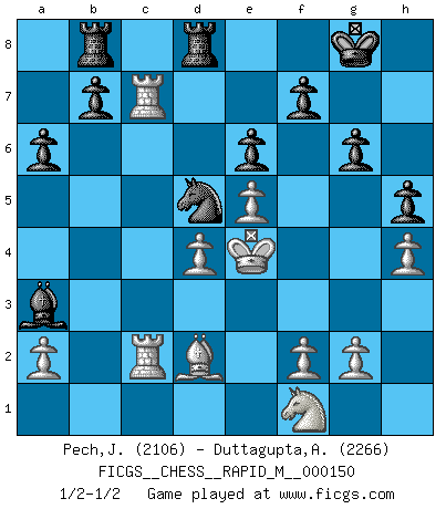 Last move : 1/2-1/2 2024 January 30 4:2:34 [Event "FICGS__CHESS__RAPID_M__000150"] [Site "FICGS"] [Date "2023.09.22"] [Round "1"] [White "Pech,Jaroslav"] [Black "Duttagupta,Aniruddha"] [Result "1/2-1/2"] [WhiteElo "2106"] [BlackElo "2266"] 1.d4 Nf6 2.c4 g6 3.Nc3 d5 4.cxd5 Nxd5 5.e4 Nxc3 6.bxc3 Bg7 7.Nf3 c5 8.Be3 Qa5 9.Qd2 Nc6 10.Rb1 a6 11.Rc1 cxd4 12.cxd4 Qxd2+ 13.Kxd2 e6 14.Bd3 O-O 15.h4 h6 16.e5 Rd8 17.Rc4 Bd7 18.Be4 Na5 19.Rc7 Bb5 20.Rhc1 Rab8 21.Bd3 Bxd3 22.Kxd3 Nc6 23.Ke4 Nb4 24.R7c4 Nd5 25.Bd2 Bf8 26.Nh2 h5 27.Nf1 Ba3 28.R1c2 Nb6 29.Rc7 Nd5 30.R7c4 Nb6 31.Rc7 Nd5 1/2-1/2 Follow this game move after move (download)Could we look into the head of a Chess player, we should see there a whole world of feelings, images, ideas, emotion and passion. (Alfred Binet) Der Knackpunkt bei der Konzentration ist, daß wir nur durch sie etwas Neues und Ungewöhnliches am Schachbrett finden können. Sie ist der einzige Weg durch neue neue Ideen eine Überraschung zu bereiten. (Garry Kasparov) Si tu oponente te ofrece un empate, trata de averiguar porque piensa él que esta en una posición peor. (Nigel Short) Si rien de grave n'est détecté lors de l'analyse d'une position, on joue alors le coup. Seconde règle de Blumenfeld. Is not life a hundred times too short to bore ourselves ? (Friedrich Nietzsche)