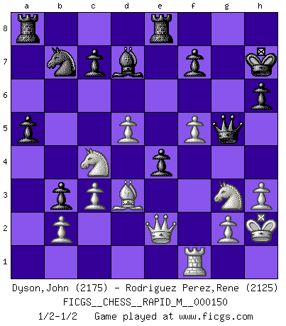 Last move : 1/2-1/2 2023 December 7 20:5:14 [Event "FICGS__CHESS__RAPID_M__000150"] [Site "FICGS"] [Date "2023.09.22"] [Round "1"] [White "Dyson,John"] [Black "Rodriguez Perez,Rene"] [Result "1/2-1/2"] [WhiteElo "2175"] [BlackElo "2125"] 1.e4 e5 2.Nf3 Nc6 3.Bc4 Nf6 4.d3 Bc5 5.c3 d6 6.O-O O-O 7.h3 a6 8.a4 Ba7 9.Re1 b5 10.Bb3 b4 11.Nbd2 Rb8 12.Bc2 Be6 13.a5 h6 14.Nf1 b3 15.Bb1 d5 16.exd5 Qxd5 17.Be3 Bxe3 18.fxe3 Qd6 19.d4 Rfe8 20.e4 Rbd8 21.d5 Nxa5 22.N3d2 Qb6+ 23.Kh2 Bd7 24.Qe2 Ra8 25.Ng3 Nb7 26.Rf1 a5 27.Nc4 Qc5 28.Rxf6 gxf6 29.Bd3 Qe7 30.Rf1 Kh7 31.Nh5 f5 32.exf5 Qg5 33.Ng3 e4 1/2-1/2 Follow this game move after move (download)Chess is 99 percent tactics. (Teichmann) Dieses schreckliche Gefühl, dass ich gegen eine Maschine spielte, die niemals Fehler macht, zerschmetterte meinen Widerstand. (Mark Taimanov) El jugador blanco perdió porque fallo en recordar la coreccta continuación y tuvo que pensar por sí mismo las movidas. (Siegbert Tarrasch) Je menace de comprendre la position. (Anonyme) I can't decide which is riskier; taking crazy risks, or taking advice on crazy risks from a crazy risk taker. (Gregory House in House M.D.)