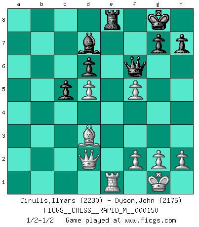 Last move : 1/2-1/2 2023 November 5 22:12:26 [Event "FICGS__CHESS__RAPID_M__000150"] [Site "FICGS"] [Date "2023.09.22"] [Round "1"] [White "Cirulis,Ilmars"] [Black "Dyson,John"] [Result "1/2-1/2"] [WhiteElo "2230"] [BlackElo "2175"] 1.d4 Nf6 2.c4 e6 3.e3 Be7 4.d5 O-O 5.Nc3 Re8 6.a3 a5 7.Nf3 Na6 8.Be2 Nc5 9.b3 exd5 10.cxd5 Nce4 11.Bb2 Nxc3 12.Bxc3 Ne4 13.Bb2 c5 14.Nd2 Nxd2 15.Qxd2 d6 16.b4 axb4 17.axb4 Rxa1+ 18.Bxa1 Bd7 19.O-O b6 20.bxc5 bxc5 21.e4 Bf6 22.Bd3 Bxa1 23.Rxa1 f5 24.exf5 Qf6 25.Re1 1/2-1/2 Follow this game move after move (download)Chess is the art which expresses the science of logic. (Mikhail Botvinnik) Wer sich die Fähigkeit anerziehen will im Schach selbstständig zu denken, der muß alles meiden, was leblos ist: ausgeklügelte Theorien, die sich auf sehr wenige Beispiele und eine Menge Hirngespinste stützen. (Emanuel Lasker) Cuando no sepas que mover, espera por una idea que se le venga a la la cabeza de tu oponente. Tenlo por seguro de que esa idea estará incorrecta. (Siegbert Tarrasch) J'ai vu le vaincu d'Echecs jouer des années durant dans l'espoir de la fête de la victoire. Car tu es plus riche de ce qu'elle existe si même elle n'est point pour toi. Ainsi de la perle du fond des mers. (Antoine de Saint-Exupéry) Mac users swear by their computers. PC users swear at their computers. (Author unknown)