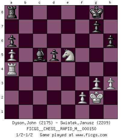 Last move : 1/2-1/2 2023 November 19 12:42:5 [Event "FICGS__CHESS__RAPID_M__000150"] [Site "FICGS"] [Date "2023.09.22"] [Round "1"] [White "Dyson,John"] [Black "Swiatek,Janusz"] [Result "1/2-1/2"] [WhiteElo "2175"] [BlackElo "2209"] 1.e4 e5 2.Nf3 Nc6 3.Bc4 Bc5 4.d3 d6 5.O-O a6 6.c3 Nf6 7.Re1 O-O 8.h3 h6 9.Nbd2 Be6 10.Bxe6 fxe6 11.b4 Ba7 12.a4 Nh5 13.Nf1 Qf6 14.N1h2 Nf4 15.Ra2 Qg6 16.Bxf4 Rxf4 17.b5 Nb8 18.bxa6 bxa6 19.Qb3 Nc6 20.Qc4 Qe8 21.a5 Qd7 22.g3 R4f8 23.Rb1 Nd8 24.d4 exd4 25.cxd4 d5 26.exd5 Qxd5 27.Qxd5 exd5 28.Kg2 Nc6 29.Rc1 Nb4 30.Ra4 c5 31.Ne5 Rfc8 32.Nhf3 Nc6 33.dxc5 Nxe5 34.Nxe5 Rxc5 35.Rxc5 Bxc5 1/2-1/2 Follow this game move after move (download)Live, lose, and learn, by observing your opponent how to win. (Amber Steenbock) Ich würde die 30 stärksten Spieler der USA im Simultanspiel besiegen. (José Raúl Capablanca) Los libros de Ajedrez deben de usarse igual como usamos los anteojos: para mejorar la vista, aunque algunos jugadores los quieren usar como si ellos les otorgaran la vision. (José Raúl Capablanca) On a dit que l'homme se distingue de l'animal par le fait qu'il achète plus de livres qu'il ne peut en lire. Je voudrais suggérer qu'inclure à la liste des livres quelques livres d'échecs rendrait la distinction manifeste. (Edward Lasker) Watch your thoughts; they become words. Watch your words; they become actions. Watch your actions; they become habits. Watch your habits; they become character. Watch your character; it becomes your destiny. (Frank Outlaw)