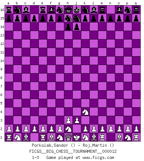 Last move : 1-0 2007 October 10 0:9:54 [Event "FICGS__BIG_CHESS__TOURNAMENT__000012"] [Site "FICGS"] [Date "2007.09.08"] [Round "1"] [White "Porkolab,Sandor"] [Black "Roj,Martin"] [Result "1-0"] [WhiteElo ""] [BlackElo ""] 1.j2-k4 1-0 This big chess game has been lost on time (started : 2007.09.08 1:54:3) Follow this game move after move (download)During a Chess competition a Chessmaster should be a combination of a beast of prey and a monk. (Alexander Alekhine) Wenn man heute mit 14 Jahren noch kein GM ist, kann man es vergessen. (Viswanathan Anand) Cuando no sepas que mover, espera por una idea que se le venga a la la cabeza de tu oponente. Tenlo por seguro de que esa idea estará incorrecta. (Siegbert Tarrasch) Les Echecs, c'est l'art de la guerre sans les charniers, c'est la résurrection des morts tombés au champ d'honneur, l'espoir perpétuel, la suprématie de l'intelligence sur la force, la culture de l'esprit. (F. Szpiner) There's no money in correspondence chess. (John Knudsen)