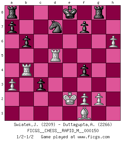 Last move : 1/2-1/2 2023 December 6 20:3:16 [Event "FICGS__CHESS__RAPID_M__000150"] [Site "FICGS"] [Date "2023.09.22"] [Round "1"] [White "Swiatek,Janusz"] [Black "Duttagupta,Aniruddha"] [Result "1/2-1/2"] [WhiteElo "2209"] [BlackElo "2266"] 1.e4 e6 2.d4 d5 3.Nc3 Bb4 4.e5 c5 5.a3 Bxc3+ 6.bxc3 Ne7 7.Qg4 Qc7 8.Qxg7 Rg8 9.Qxh7 cxd4 10.Rb1 Qxe5+ 11.Ne2 dxc3 12.h4 b6 13.Bf4 Qf5 14.Qxf5 Nxf5 15.h5 Ba6 16.Rb3 d4 17.h6 Nd7 18.Rb4 e5 19.Rh5 d3 20.cxd3 exf4 21.Rxf5 Bxd3 22.Rd5 Bxe2 23.Kxe2 1/2-1/2 Follow this game move after move (download)Alekhine is a poet who creates a work of art out of something that would hardly inspire another man to send home a picture post card. (Max Euwe) Die starken Figuren des Gegners muss man abtauschen. (José Raúl Capablanca) No todos los artistas son jugadores de Ajedrez, pero todos los jugadores de Ajedrez son artistas. (Marcel Duchamp) Dieu déplace le joueur, et celui-ci la pièce. Quel Dieu derrière Dieu commence donc la trame ? Arturo Perez-Reverte (prix de littérature policière 1993). Locking firmely the window serves nothing, only small thiefs pass through there, the big thiefs enter through the front door. (Luc-Olivier Leclerc)