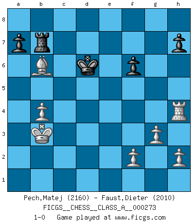 Last move : 1-0 2024 July 12 8:48:49 [Event "FICGS__CHESS__CLASS_A__000273"] [Site "FICGS"] [Date "2023.09.23"] [Round "1"] [White "Pech,Matej"] [Black "Faust,Dieter"] [Result "1-0"] [WhiteElo "2160"] [BlackElo "2010"] 1.e4 e5 2.Nf3 Nc6 3.Bb5 Nf6 4.O-O Nxe4 5.d4 Be7 6.Qe2 Nd6 7.Bxc6 bxc6 8.dxe5 Nf5 9.Qe4 g6 10.c4 O-O 11.Nc3 Re8 12.Bf4 Rb8 13.Qc2 d6 14.Rad1 Be6 15.b3 g5 16.Bc1 Ng7 17.Nd4 Qd7 18.exd6 cxd6 19.Ne4 Bf5 20.Nxf5 Qxf5 21.Qd3 Rbd8 22.Nxg5 Qxd3 23.Rxd3 d5 24.cxd5 cxd5 25.Rfd1 d4 26.Nf3 Bf6 27.b4 Ne6 28.Bd2 Rc8 29.Kf1 Kg7 30.Ra3 Re7 31.Rc1 Rxc1+ 32.Bxc1 Rb7 33.Bd2 Nc7 34.Rd3 Nb5 35.a4 Nc3 36.Nxd4 Bxd4 37.Rxd4 Nxa4 38.Ke2 Kf6 39.Kd3 Ke6 40.Rh4 f6 41.Be3 Kf5 42.g3 Ke6 43.Kc2 Kd6 44.Kb3 Nb6 45.Bxb6 1-0 Follow this game move after move (download)I played Chess with him and would have beaten him sometimes only he always took back his last move, and ran the game out differently. (Mark Twain) Gewöhnliche Menschen denken nur daran, wie sie ihre Zeit verbringen. Ein intelligenter Mensch versucht, sie auszunutzen. (Arthur Schopenhauer) En el Ajedrez, tal como es jugado por los Maestros, practicamente la suerte es eliminada. (Emanuel Lasker) Ne tendez aucun piège pour le plaisir ! Ne jouez rien dans l'espoir que l'adversaire réagisse de façon stupide ! Prenez toujours pour acquis que l'adversaire va trouver le meilleur coup ! Ne jouez jamais de coup dans l'espoir que l'adversaire ne voie pas la menace ! Chacun de vos coups doit améliorer la position d'une façon ou d'une autre. Sometimes it pays to stay in bed in Monday, rather than spending the rest of the week debugging Monday's code. (Dan Salomon)