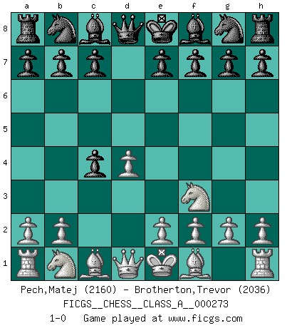 Last move : 1-0 2023 November 7 22:46:49 [Event "FICGS__CHESS__CLASS_A__000273"] [Site "FICGS"] [Date "2023.09.23"] [Round "1"] [White "Pech,Matej"] [Black "Brotherton,Trevor"] [Result "1-0"] [WhiteElo "2160"] [BlackElo "2036"] 1.d4 d5 2.c4 dxc4 3.Nf3 1-0 Follow this game move after move (download)Tactics flow from a superior position. (Bobby Fischer) Ich kenne keine einzige Person, die behaupten würde, Garri Kasparow sei ein guter Mensch (Nigel Short) Los errores estan ahí, esperando a que se cometan. (Savielly Tartakower) Le temps de noter son nom sur la feuille de partie, j'étais déjà en zeitnot ! D'un modeste amateur apparié lors de la première ronde d'un open contre le grand-maître Azmaïparashvili. Computers make it easier to do a lot of things, but most of the things they make it easier to do don't need to be done. (Andy Rooney)