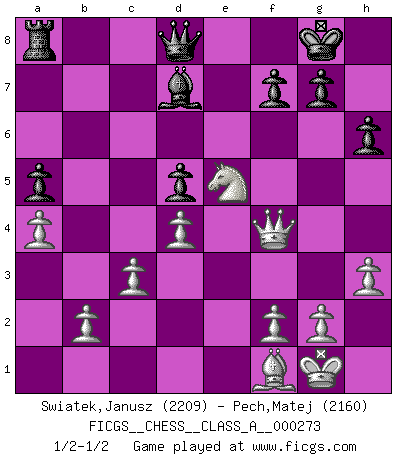 Last move : 1/2-1/2 2024 June 17 1:8:44 [Event "FICGS__CHESS__CLASS_A__000273"] [Site "FICGS"] [Date "2023.09.23"] [Round "1"] [White "Swiatek,Janusz"] [Black "Pech,Matej"] [Result "1/2-1/2"] [WhiteElo "2209"] [BlackElo "2160"] 1.e4 e5 2.Nf3 Nc6 3.Bb5 Nf6 4.O-O Nxe4 5.Re1 Nd6 6.Nxe5 Be7 7.Bf1 Nxe5 8.Rxe5 O-O 9.d4 Bf6 10.Re1 Nf5 11.c3 d5 12.Nd2 c6 13.a4 a5 14.Nf3 Nd6 15.Bf4 Bf5 16.h3 h6 17.Qb3 Be4 18.Nd2 Bg6 19.Nf3 Be4 20.Ne5 Re8 21.Re2 Be7 22.Rae1 Bg5 23.Bg3 Bf5 24.Nf3 Rxe2 25.Rxe2 Be7 26.Bxd6 Bxd6 27.Qxb7 Rb8 28.Qa6 Ra8 29.Qb7 Rb8 30.Qxc6 Rc8 31.Qb7 Rb8 32.Qa6 Ra8 33.Qc6 Rc8 34.Qb5 Rb8 35.Qa6 Ra8 36.Re8+ Qxe8 37.Qxd6 Qd8 38.Qf4 Bd7 39.Ne5 1/2-1/2 Follow this game move after move (download)When in doubt... play Chess ! (Tevis) Schon mancher Spieler hat aufgegeben, um zu vermeiden, daß er eine Figur verliert. (Savielly Grigorievitsch Tartakower) El jugador táctico sabe que hacer cuando hay algo que hacer; mientras que el estratega sabe que hacer cuando no hay nada que hacer. (Gerald Abrahams) 'L'échange des dames est un coup dur pour les deux adversaires...' Un journaliste lors d'une partie du match Spassky-Fischer It's only after you lost everything, Tyler says, that you're free to do anything. (Chuck Palahniuk, Fight Club)