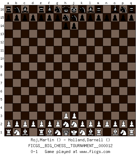Last move : 0-1 2007 October 8 6:0:16 [Event "FICGS__BIG_CHESS__TOURNAMENT__000012"] [Site "FICGS"] [Date "2007.09.08"] [Round "1"] [White "Roj,Martin"] [Black "Holland,Darnell"] [Result "0-1"] [WhiteElo ""] [BlackElo ""] 0-1 This big chess game has been lost on time (started : 2007.09.08 1:54:3) Follow this game move after move (download)You may learn much more from a game you lose than from a game you win. You will have to lose hundreds of games before becoming a good player. (Jose Raul Capablanca) Konzentriere dich auf materielle Gewinne. Nimm, was dir dein Gegner gibt, ausser es gibt einen guten Grund der dagegenspricht. (Robert James Fischer) En posiciones complicadas, Bobby Fischer pocas veces tuvo que temer de cualquiera. (Paul Keres) On n'a jamais que l'âge auquel on a commence à jouer aux échecs car après on cesse de vieillir. (Capablanca) Good luck. You're gonna need it. (Han Solo in Star Wars ep.6)