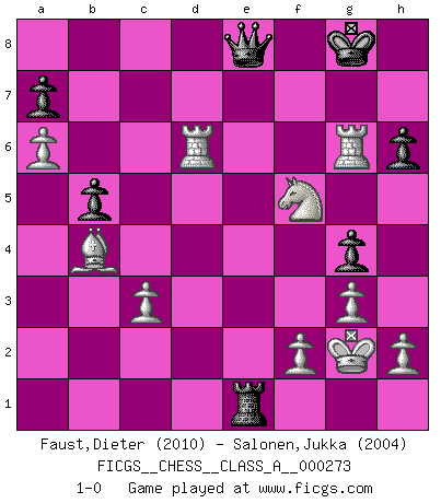 Last move : 1-0 2023 December 2 8:35:55 [Event "FICGS__CHESS__CLASS_A__000273"] [Site "FICGS"] [Date "2023.09.23"] [Round "1"] [White "Faust,Dieter"] [Black "Salonen,Jukka"] [Result "1-0"] [WhiteElo "2010"] [BlackElo "2004"] 1.d4 d5 2.c4 e6 3.Nf3 Nf6 4.Nc3 c6 5.Bg5 h6 6.Bh4 dxc4 7.e4 g5 8.Bg3 b5 9.Be2 Bb7 10.O-O Nbd7 11.Ne5 Bg7 12.Nxd7 Nxd7 13.Bd6 Qb6 14.e5 c5 15.a4 cxd4 16.a5 Qd8 17.Qxd4 Nxe5 18.a6 Bc8 19.Rfd1 Nf3+ 20.Bxf3 Bxd4 21.Rxd4 Bd7 22.Rad1 g4 23.Bxa8 Qxa8 24.Ne4 f5 25.Nf6+ Kf7 26.Nxd7 Re8 27.Bb4 Kg6 28.Nc5 Kh5 29.Rd6 Qc8 30.Re1 Kg6 31.Nxe6 Kf7 32.g3 c3 33.bxc3 Re7 34.Re5 Re8 35.Rxf5+ Kg6 36.Nd4 Kg7 37.R5f6 Re1+ 38.Kg2 Qe8 39.Nf5+ Kg8 40.Rg6+ 1-0 Follow this game move after move (download)You need not play well - just help your opponent to play badly. (Genrikh Chepukaitis) Es ist nicht das erste mal, dass sich die FIDE dem Arabischen Geld gebeugt hat (über die FIDE WM 2004 in Lybien). (Larry Evans) Te sientas frente a un tablero y repentinamente tu corazón brinca. Tu mano tiembla al tomar una pieza y moverla. Pero lo que el Ajedrez te enseña es que tu debes permanecer ahí con calma y pensar de que si realmente es una buena idea o de que si hay otras ideas mejores. (Stanley Kubrick) Les sacrifices démontrent seulement que quelqu'un a gaffé. (Savielly Tartacover) It is the aim of the modern school, not to treat every position according to one general law, but according to the principle inherent in the position. (Richard Reti)