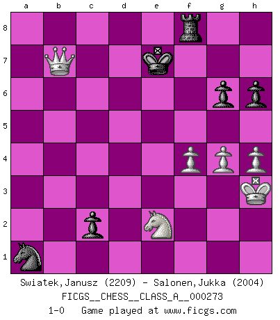 Last move : 1-0 2024 January 21 8:26:25 [Event "FICGS__CHESS__CLASS_A__000273"] [Site "FICGS"] [Date "2023.09.23"] [Round "1"] [White "Swiatek,Janusz"] [Black "Salonen,Jukka"] [Result "1-0"] [WhiteElo "2209"] [BlackElo "2004"] 1.e4 e5 2.Nf3 Nc6 3.Bb5 a6 4.Ba4 Nf6 5.O-O Be7 6.Re1 b5 7.Bb3 O-O 8.c3 d6 9.h3 Na5 10.Bc2 c5 11.d4 Qc7 12.d5 Bd7 13.b3 Nb7 14.Kh2 c4 15.b4 a5 16.a4 bxa4 17.Na3 axb4 18.cxb4 c3 19.Be3 Nh5 20.Ng1 Nf4 21.g3 Ng6 22.Qe2 Qc8 23.Nb5 f5 24.exf5 Bxf5 25.Rxa4 Rxa4 26.Bxa4 e4 27.Na7 Qc7 28.Bc6 Nd8 29.Ra1 Nxc6 30.Nxc6 Bf6 31.Ra7 Qc8 32.b5 Bd7 33.Qa2 Kh8 34.b6 Bxc6 35.dxc6 Qxc6 36.Rc7 Qe8 37.Ne2 Ne5 38.Kg2 Nf3 39.b7 Be5 40.Rc8 Qxc8 41.bxc8Q Rxc8 42.Qd5 Ne1+ 43.Kf1 Nf3 44.h4 h6 45.Kg2 Ne1+ 46.Kh3 Nc2 47.Bc1 Na1 48.Qxe4 c2 49.f4 Bf6 50.Qb7 Re8 51.Qb5 Rf8 52.g4 g6 53.Bb2 Kg8 54.Bxf6 Rxf6 55.Qb8+ Rf8 56.Qxd6 Kf7 57.Qd5+ Ke7 58.Qb7+ 1-0 Follow this game move after move (download)Many Chess players were surprised when after the game, Fischer quietly explained: 'I had already analyzed this possibility' in a position which I thought was not possible to foresee from the opening. (Mikhail Tal) Wie kann ich Remis annehmen? Ich weiß ja gar nicht, wie ich stehe! (Fritz Sämisch) Sin errores no puede haber brillantez. (Emanuel Lasker) Le jeu d'échecs est comme rejeté hors du temps. (Antoine de Saint-Exupéry) Plans are ideas that never come to fruition. (Daniel Parmet)