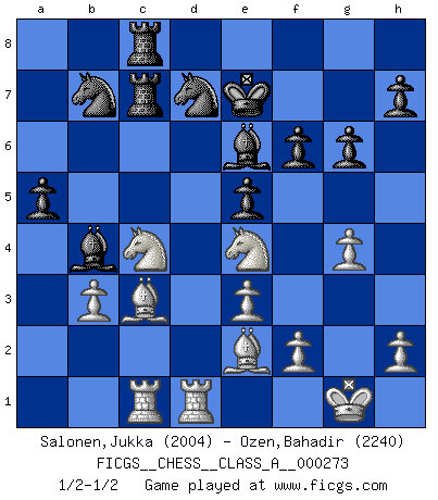 Last move : 1/2-1/2 2023 October 21 8:6:31 [Event "FICGS__CHESS__CLASS_A__000273"] [Site "FICGS"] [Date "2023.09.23"] [Round "1"] [White "Salonen,Jukka"] [Black "Ozen,Bahadir"] [Result "1/2-1/2"] [WhiteElo "2004"] [BlackElo "2240"] 1.d4 d5 2.Nf3 Nf6 3.c4 dxc4 4.e3 e6 5.Bxc4 c5 6.O-O a6 7.dxc5 Bxc5 8.Qxd8+ Kxd8 9.Be2 Ke7 10.b3 Nbd7 11.Nbd2 b6 12.Bb2 Bb7 13.Rfd1 Rhd8 14.Nc4 Rac8 15.a3 Bd5 16.Ncd2 a5 17.Bb5 Ne8 18.Ba6 Rc7 19.Be2 f6 20.Rac1 e5 21.Nc4 Be6 22.Nfd2 Nd6 23.g4 Nb7 24.Ne4 b5 25.Ncd2 b4 26.Nc4 Rdc8 27.axb4 Bxb4 28.Bc3 g6 1/2-1/2 Follow this game move after move (download)We must make sure that Chess will not be like a dead language, very interesting, but for a very small group. (Sytze Faber) Sie bekommen vielleicht den Eindruck, dass die Spitzenspieler überhaupt gar nicht so stark sind. Aber das stimmt nicht. Es ist eine Illusion. Mit einem Computer an der Seite ist es sehr leicht, Urteile zu fällen, aber wenn man alleine am Brett sitzt, sieht die Sache ganz anders aus. (Vladimir Kramnik) Aunque la mayoría de la gente disfruta observar las partidas de los grandes Maestros de ataque, algunos de los jugadores mas notables en la historia han sido los jugadores silenciosos posicionales. Lentamente ellos te aplastan despojandote de tu espacio, congestionando tus piezas y dejandote virtualmente sin nada que hacer. (Yasser Seirawan) Les Echecs mettent en conflit, non pas deux intelligences, mais deux volontés. (Lasker) After growing wildly for years, the field of computing appears to be reaching its infancy. (John Pierce)