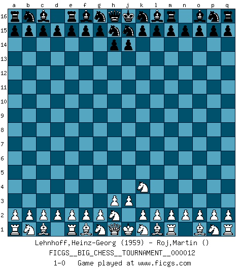 Last move : 1-0 2007 October 8 6:0:16 [Event "FICGS__BIG_CHESS__TOURNAMENT__000012"] [Site "FICGS"] [Date "2007.09.08"] [Round "1"] [White "Lehnhoff,Heinz-Georg"] [Black "Roj,Martin"] [Result "1-0"] [WhiteElo "1959"] [BlackElo ""] 1.j2-k4 1-0 This big chess game has been lost on time (started : 2007.09.08 1:54:3) Follow this game move after move (download)There's never before been a Chess player with such a thorough knowledge of the intricacies of the game and such an absolutely indomitable will to win. I think Bobby is the greatest player that ever lived. (Lisa Lane) Ich könnte leicht behaupten: Ja,ja, Leonid Breschnew wollte nicht, daß ich Weltmeister werde. In der Tat war die Sache komplizierter. (Viktor Kortschnoi) Es muy difícil jugar en contra de la teoría de Einstein. - en su primera derrota en contra de Fischer (Mikhail Tal) Je ne crois pas en la psychologie, je crois aux bons coups. (Robert Fischer) Before all elsed, be armed. (Niccolo Machiavelli)