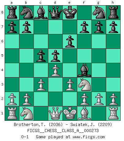 Last move : 0-1 2023 November 7 22:47:13 [Event "FICGS__CHESS__CLASS_A__000273"] [Site "FICGS"] [Date "2023.09.23"] [Round "1"] [White "Brotherton,Trevor"] [Black "Swiatek,Janusz"] [Result "0-1"] [WhiteElo "2036"] [BlackElo "2209"] 1.Nf3 d5 2.d4 e6 3.Bf4 c5 4.c3 Bd6 5.e3 Bxf4 0-1 Follow this game move after move (download)Avoid the crowd. Do your own thinking independently. Be the Chess player, not the Chess piece. (Ralph Charell) Eine Person mit durchschnittlichem IQ kann etwa eine ELO von 2000 erreichen. (Jonathan Levitt) No es suficiente ser un buen jugador, se debe también de jugar bién. (Siegbert Tarrasch) Le plus grand jeu de l'esprit jamais inventé, plus vous l'apprenez, plus vous y prenez du plaisir. (Garry Kasparov) Every now and then a man's mind is stretched by a new idea and never shrinks back to its former dimensions. (Oliver Wendell Holmes, Sr.)
