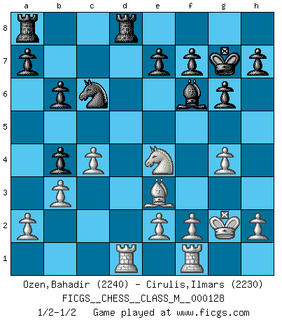 Last move : 1/2-1/2 2023 October 25 19:19:58 [Event "FICGS__CHESS__CLASS_M__000128"] [Site "FICGS"] [Date "2023.09.25"] [Round "1"] [White "Ozen,Bahadir"] [Black "Cirulis,Ilmars"] [Result "1/2-1/2"] [WhiteElo "2240"] [BlackElo "2230"] 1.c4 d6 2.d4 Nf6 3.Nf3 g6 4.g3 Bg7 5.Bg2 O-O 6.Nc3 c5 7.O-O Nc6 8.dxc5 dxc5 9.Be3 Qa5 10.Qb3 Qb4 11.Qxb4 cxb4 12.Nd5 Bf5 13.Rad1 Be4 14.b3 Rfd8 15.Ng5 Bxg2 16.Kxg2 b6 17.Nxf6+ Bxf6 18.g4 Kg7 19.Ne4 1/2-1/2 Follow this game move after move (download)The Pawns are the soul of the game. (Francois Andre Danican Philidor) Alles was ich jemals tun will ist Schach spielen. (Robert James Fischer) Te sientas frente a un tablero y repentinamente tu corazón brinca. Tu mano tiembla al tomar una pieza y moverla. Pero lo que el Ajedrez te enseña es que tu debes permanecer ahí con calma y pensar de que si realmente es una buena idea o de que si hay otras ideas mejores. (Stanley Kubrick) Le système Elo représente seulement une moyenne. Il est simplement un indicateur de votre stabilité. (Anatoli Karpov) The weakness of an artist is dogma. (Josh Waitzkin)