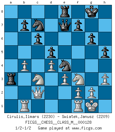 Last move : 1/2-1/2 2023 December 2 0:20:55 [Event "FICGS__CHESS__CLASS_M__000128"] [Site "FICGS"] [Date "2023.09.25"] [Round "1"] [White "Cirulis,Ilmars"] [Black "Swiatek,Janusz"] [Result "1/2-1/2"] [WhiteElo "2230"] [BlackElo "2209"] 1.d4 Nf6 2.c4 e6 3.Nf3 d5 4.cxd5 exd5 5.Nc3 c6 6.Qc2 g6 7.Bg5 Be7 8.e3 Bf5 9.Bd3 Bxd3 10.Qxd3 O-O 11.O-O Nbd7 12.Bh6 Re8 13.h3 a5 14.Nd2 Bf8 15.Bxf8 Nxf8 16.a3 Qe7 17.Rab1 Ne6 18.Nf3 h5 19.b4 axb4 20.axb4 Ra3 21.Qd2 Nc7 22.Qc2 Ne4 1/2-1/2 Follow this game move after move (download)It is always better to sacrifice your opponent's men. (Savielly Tartakower) Aljechin war kein Nazi. Er war ein Opportunist. Ein schrecklicher Mann. Er liebte Geld über alles und würde für Geld ein Jude, ein Katolik oder ein Protestant werden. (Miguel Najdorf) Sin errores no puede haber brillantez. (Emanuel Lasker) Votre prénom est 'Tactique', votre deuxième prénom est 'Tactique' et votre nom est 'Tactique'. (Ken Smith) Art is the only way to run away without leaving home. (Twyla Tharp)