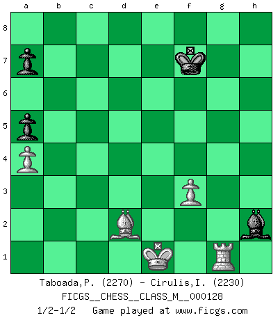 Last move : 1/2-1/2 2024 February 13 10:9:11 [Event "FICGS__CHESS__CLASS_M__000128"] [Site "FICGS"] [Date "2023.09.25"] [Round "1"] [White "Taboada,Pedro Pablo"] [Black "Cirulis,Ilmars"] [Result "1/2-1/2"] [WhiteElo "2270"] [BlackElo "2230"] 1.d4 d6 2.c4 Nf6 3.Nf3 g6 4.Nc3 Bg7 5.e4 O-O 6.Be2 Na6 7.O-O e5 8.Be3 Qe7 9.Qc2 exd4 10.Nxd4 c6 11.Rad1 Re8 12.f3 d5 13.cxd5 Nxd5 14.Nxd5 cxd5 15.Bxa6 bxa6 16.Nc6 Qb7 17.Rxd5 Be6 18.Rc5 Qxb2 19.Qxb2 Bxb2 20.g4 Rac8 21.Rd1 f5 22.gxf5 gxf5 23.Bg5 Kg7 24.exf5 Bxf5 25.Rd2 Ba3 26.Rxf5 Rxc6 27.Rg2 Kg6 28.Rd5 Kf7 29.Rd7+ Kf8 30.Rxh7 Re1+ 31.Kf2 Rc2+ 32.Kxe1 Rxg2 33.Bd2 a5 34.Rh4 Bd6 35.a4 Kf7 36.Rd4 Bxh2 37.Rg4 Rg1+ 38.Rxg1 1/2-1/2 Follow this game move after move (download)Morphy was probably the greatest genius of them all. (Bobby Fischer) Das Schachspiel übertrifft alle anderen Spiele so weit wie der Chimborasso einen Misthaufen. (Arthur Schopenhauer) Tu sabes que vas a perder. Aún cuando tenía la ventaja, yo sabía que iba a perder. - al estar jugando con Fischer (Andrew Soltis) La vie est comme un jeu d'échecs : nous esquissons un plan, mais celui-ci est tributaire de ce que daignent faire l'adversaire aux échecs et le destin dans la vie. (Arthur Schopenhauer) The intuitive mind is a sacred gift; the rational mind is a faithful servant. We have created a society that honors the servant but has forgotten the gift. (Albert Einstein)