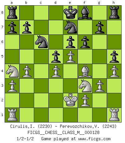 Last move : 1/2-1/2 2023 November 10 18:57:13 [Event "FICGS__CHESS__CLASS_M__000128"] [Site "FICGS"] [Date "2023.09.25"] [Round "1"] [White "Cirulis,Ilmars"] [Black "Perevozchikov,Vjacheslav"] [Result "1/2-1/2"] [WhiteElo "2230"] [BlackElo "2243"] 1.d4 e6 2.e4 d5 3.e5 c5 4.c3 Nc6 5.Nf3 Qb6 6.h4 Bd7 7.g3 f6 8.Bh3 Qa6 9.Bf4 cxd4 10.cxd4 Nb4 11.Bf1 Bb5 12.Bxb5+ Qxb5 13.Nc3 Qa6 14.Qe2 Qxe2+ 15.Kxe2 h5 16.a3 Nc6 17.b4 Nge7 18.Na4 1/2-1/2 Follow this game move after move (download)The essence of Chess is thinking about what Chess is. (David Bronstein) Ich bin stolz ein Bulgare zu sein. (Veselin Topalov) Una buena memoria, concentración, imaginación y una fuerte voluntad, se requiere para llegar a ser un buen jugador. (Bobby Fischer) Aidez vos pièces, elles vous aideront. (Paul Morphy) Some people are so afraid to die that they never begin to live. (Henry Van Dyke)