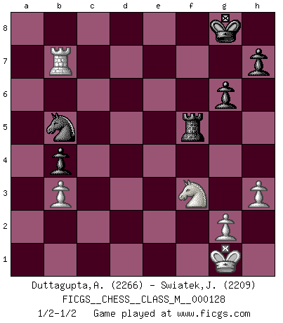Last move : 1/2-1/2 2024 May 5 17:22:15 [Event "FICGS__CHESS__CLASS_M__000128"] [Site "FICGS"] [Date "2023.09.25"] [Round "1"] [White "Duttagupta,Aniruddha"] [Black "Swiatek,Janusz"] [Result "1/2-1/2"] [WhiteElo "2266"] [BlackElo "2209"] 1.Nf3 d5 2.d4 e6 3.c4 dxc4 4.e3 a6 5.Bxc4 Nf6 6.O-O c5 7.b3 b6 8.Ba3 Nbd7 9.d5 exd5 10.Bxd5 Ra7 11.Bc4 b5 12.Bd3 g6 13.Bb2 Bg7 14.a4 b4 15.Nbd2 O-O 16.e4 Ng4 17.Bxg7 Kxg7 18.Bc4 Nge5 19.Rc1 Qe7 20.h3 a5 21.Bb5 Ba6 22.Ne1 Bxb5 23.axb5 f6 24.f4 Nf7 25.Nef3 Nd6 26.b6 Rb7 27.e5 fxe5 28.fxe5 Nf5 29.Re1 Nxb6 30.Ne4 Rc7 31.Nd6 Rd7 32.Rxc5 Nxd6 33.exd6 Qxd6 34.Qxd6 Rxd6 35.Rxa5 Rf7 36.Rb5 Nd5 37.Rd1 Nc7 38.Rxd6 Nxb5 39.Rb6 Rf5 40.Rb7+ Kg8 1/2-1/2 Follow this game move after move (download)After a bad opening, there is hope for the middle game. After a bad middle game, there is hope for the endgame. But once you are in the endgame, the moment of truth has arrived. (Edmar Mednis) Der Traum, für den ich lebe, ist der von einem freien Russland. Viele mögen sagen: Russland hat doch ein Parlament, einen gewählten Präsidenten. Aber ich spüre, dass in meiner Heimat die Angst wiederkehrt. Eine Angst, sich frei zu äußern, bestimmte Dinge zu tun (Garry Kasparov) El Ajedrez es como la guerra en un tablero. (Bobby Fischer) Plusieurs personnes se sont demandées comment Tal faisait pour gagner... En fait, c'est très simple ! Il met ses pièces au centre de l'échiquier et les sacrifie quelque part ! (David Bronstein) The bottom line is always the bottom line. (Johann Piek)